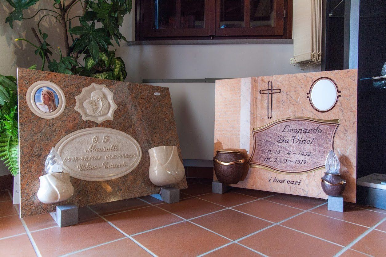 Puoi richiedere l'incisione di frasi personalizzate su lapidi e lastre funebri e arricchirle con l'applicazione di decorazioni quali fiori in marmo, lumini e vasi portafiori. Presso gli spazi espositivi della nostra agenzia, inoltre, puoi trovare casse funebri, cofani, immaginette e accessori di ogni tipo.